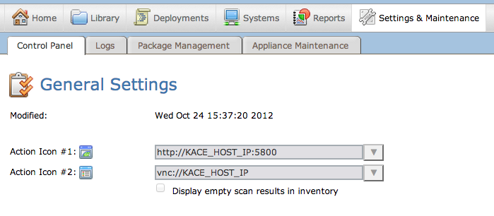 Go to the Settings and Maintenance module on your K2000 and then click General Settings. The Machine Actions listed can perform pre-configured actions against remote machines. Remote control of Windows PC’s is the default action. What about your Mac’s? On a K2000 edit Action Icon #2 and insert the following command: vnc://KACE_HOST_IP